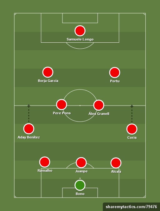 La línia del camp més diferencial és, però, la del centre del camp. Una línia que Pablo Machín completa amb un doble pivot on Pere Pons és imprescindible; dos carrilers d’anada i tornada, on destaca Aday Benítez amb 5 assistències, i dos mitja puntes com Borja García i Portu, que a part de marcar gols, és el màxim assistent de l’equip amb set passades de gol. La teranyina que formen tots aquets humans aràcnids és gairebé una missió impossible per als rivals.