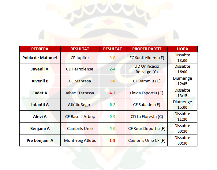 En aquest espai repassem els resultats del cap de setmana dels principals representants de la pedrera del Nàstic, que en els darrers temps estan realitzant un treball excepcional en les diferents categories. Tots ells, juntament amb els altres equips que formen el futbol base del club, són el futur de l’entitat i per això els hi volem donar la cobertura que mereixen.