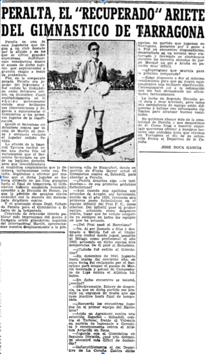 El jugador de 26 anys arribà a Tarragona el desembre de 1945 i des del principi causa un gran impacte entre la parròquia grana. Va disputar durant aquell mes de desembre sis partits de lliga amb el Nàstic, que en aquella època militava a la Segona Divisió. En aquells sis partits anota l’excel·lent xifra de set gols però fou repescat pel FC Barcelona només un mes més tard de la seva cessió, substituint a la plantilla blaugrana al lesionat Mariano Martín. Aquella acció del conjunt barceloní no va caure gens bé a la directiva grana i un cop Peralta va fer les maletes el Club Gimnàstic patí una evident davallada de resultats i joc al no poder disposar de la seva màxima referència.