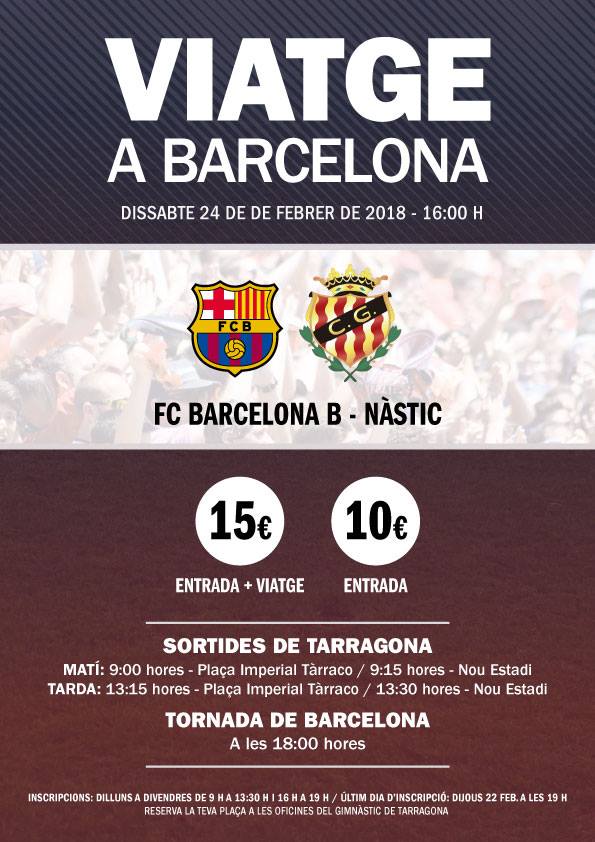 El partit es jugarà el proper dissabte 24 de febrer a les 16h. En aquesta ocasió, i de manera excepcional tenint en compte la poca distància que separa les ciutats de Tarragona i Barcelona (uns 100 quilòmetres), el club oferirà dos viatges en diferents horaris, per aquells que vulguin passar el dia a Barcelona o pel contrari prefereixin arribar amb el temps just per a viure ‘in situ’ el partit.