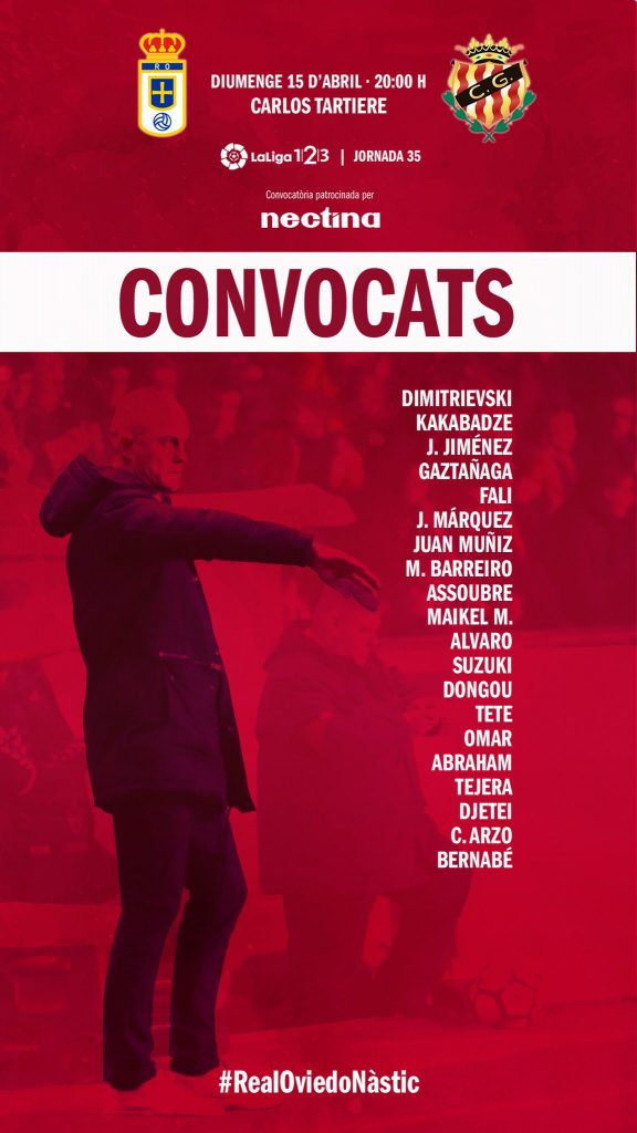 D’aquesta manera, la llista de 20 jugadors convocats que viatgen a Oviedo és la següent: Dimitrievski, Kakabadze, Javi Jiménez, Gaztañaga, Fali, Javi Márquez, Juan Muñiz, Manu Barreiro, Jean-Luc, Maikel Mesa, Álvaro Vázquez, Suzuki, Dongou, Tete Morente, Omar Perdomo, Abraham, Tejera, Djetei, César Arzo i Bernabé.