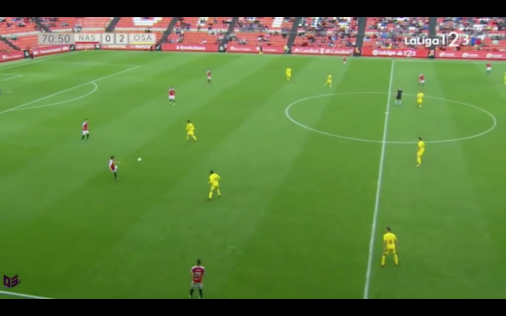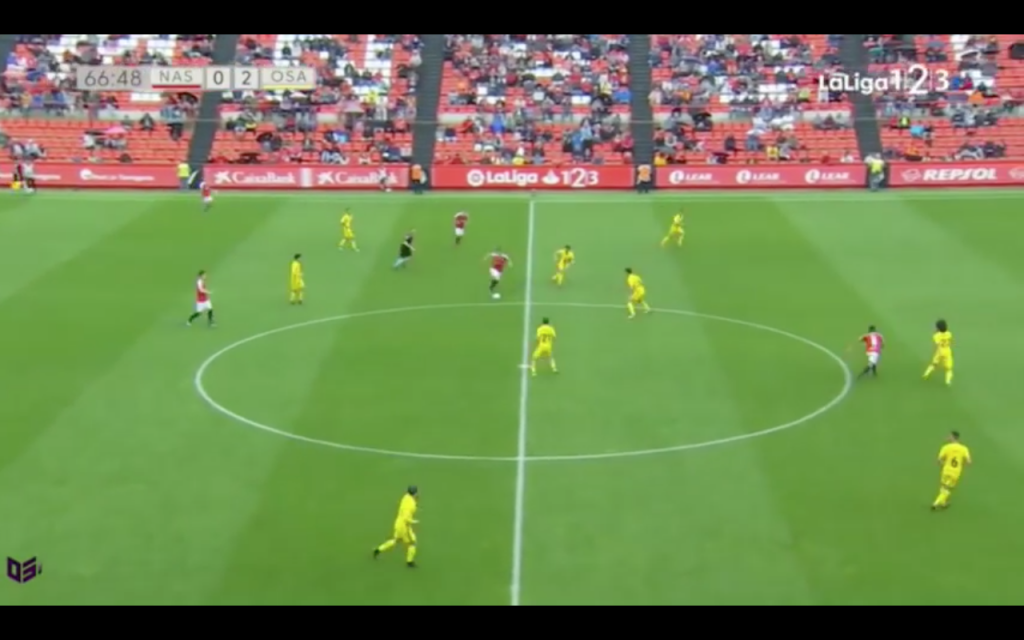 A continuació ens situem a la mateixa fase d’iniciació de joc però al cantó contrari del Nou Estadi. Osasuna inicia la jugada amb claredat, essent Aridane l’encarregat de conduir l’esfèrica sense cap tipus d’oposició. L’absència de mitjapunta facilita que el rival pugui pensar i crear còmodament un cop superada la primera línia de contenció.