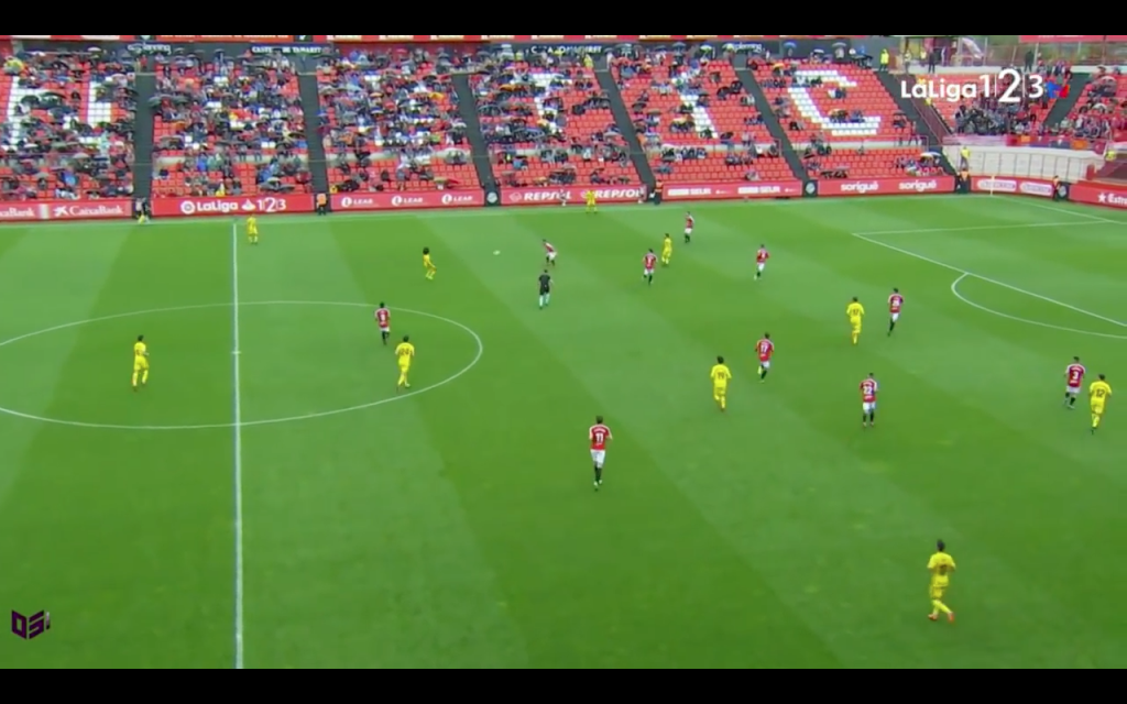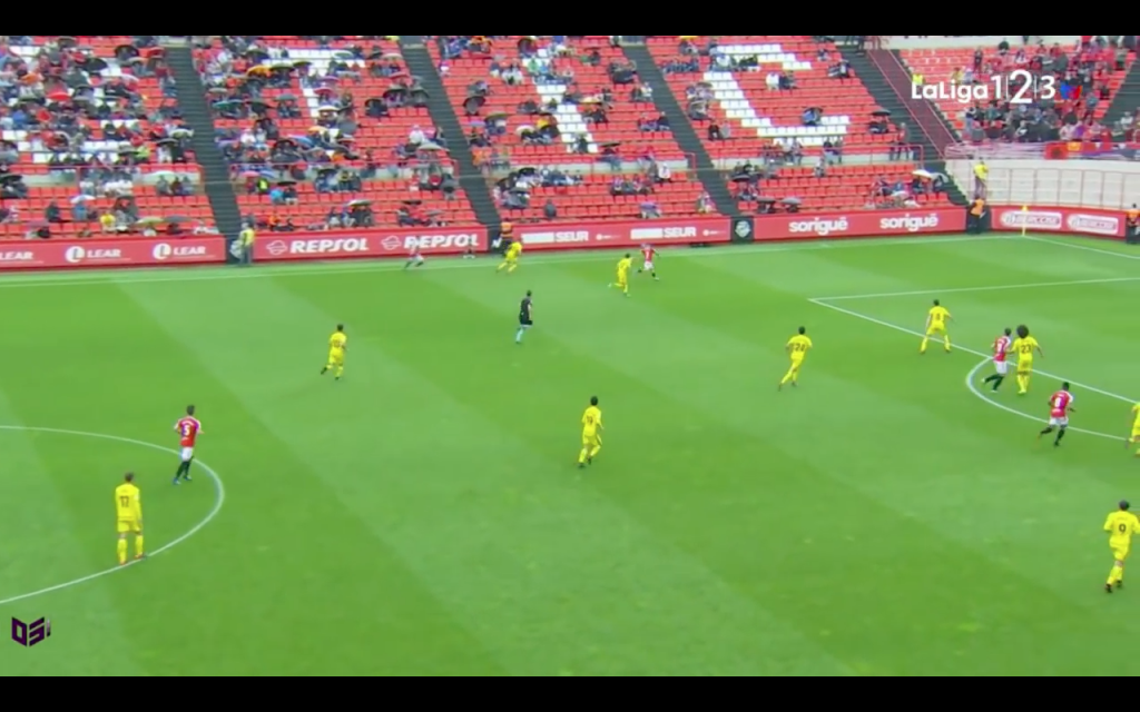 A la imatge mostrada podem observar el dèficit dels granes en el centre del camp. Ja sigui Matilla o Jon Gaztañaga havien de baixar a rebre al peu de la jugada, deixant orfe d’aquesta manera la parcel·la central de l’equip. Uche i Barreiro amb prou feines podien treure suc a la jugada al veure’s superats per una defensa rival molt endarrerida esperant sempre les contínues centrades laterals d’ambdós costats. La reacció dels navarresos davant aquest inici de joc va ser clara. L’Osasuna va plantejar un vertader acordió que va aconseguir fixar els carrils del Club Gimnàstic, mostrant una vegada rere l’altra la porta de sortida cap a una banda sense sortida.