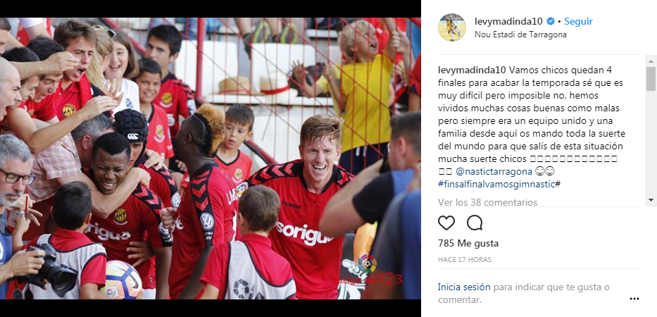 L‘exmigcampista grana Lévy Madinda, que actualment milita al Asteras Tripolis de la Primera Divisió de futbol a Grècia, va dedicar aquest dilluns un missatge d’ànim a la plantilla del Nàstic a través del seu compte d’Instagram.