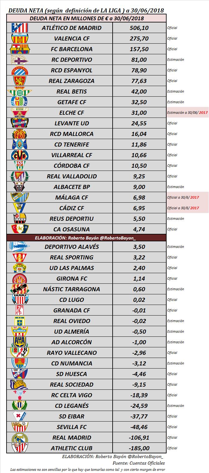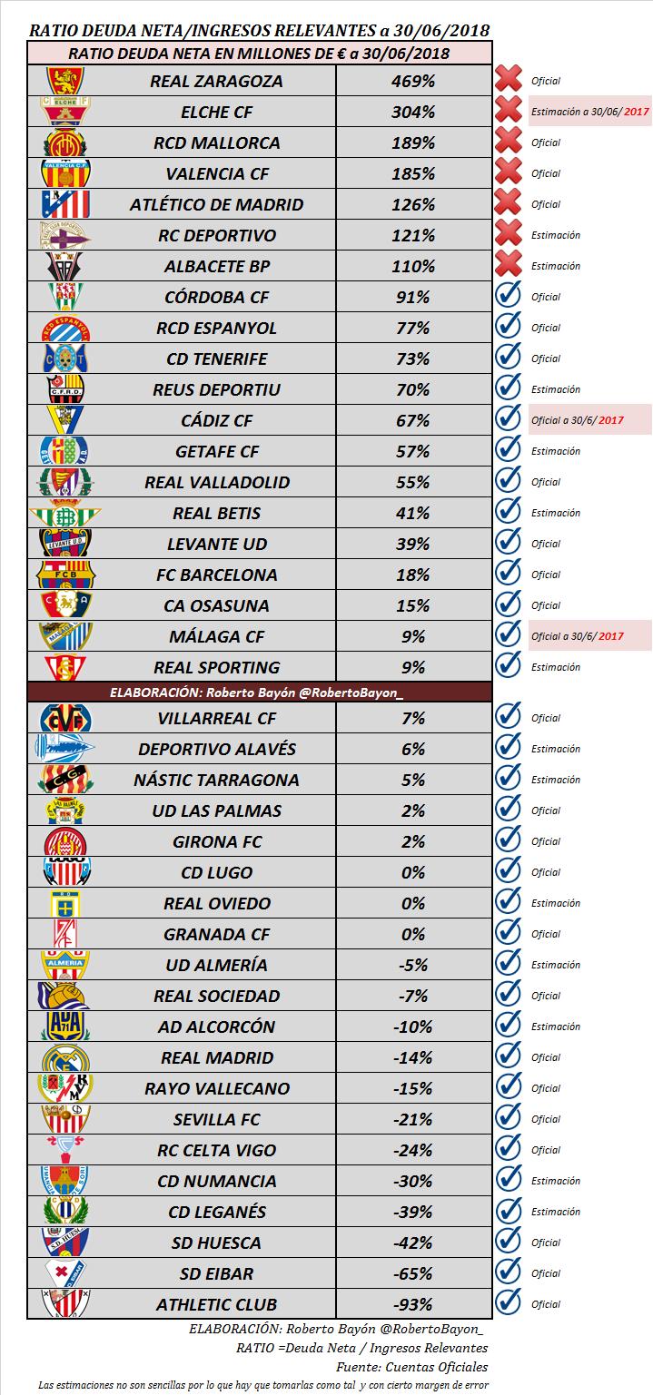 2. Que el deute total del Zaragoza és elevadíssim, al voltant dels 85,4 milions (Passiu Corrent + Passiu no corrent). Segons Roberto Bayón al seu Twitter, el deute net del Zaragoza es situa en la sisena posició del futbol professional, com podeu veure a la imatge adjunta. Així mateix, com podeu observar en l’altra imatge, la capacitat de fer front al deute net segons els ingressos, és la pitjor del futbol professional, amb una ratio d’un 469%, la Liga considera que ratios superiors al 100% són un indicador de desequilibri financer en un futur.