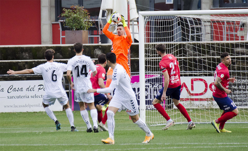 Javi Ribelles ha enviat una pilota llarga a Brugui, i aquest no ha pogut controlar-la per la sortida del porter de l’Olot, que ha estat a punt de cometre penal sobre el jugador grana, l’actual màxim golejador de l’equip.